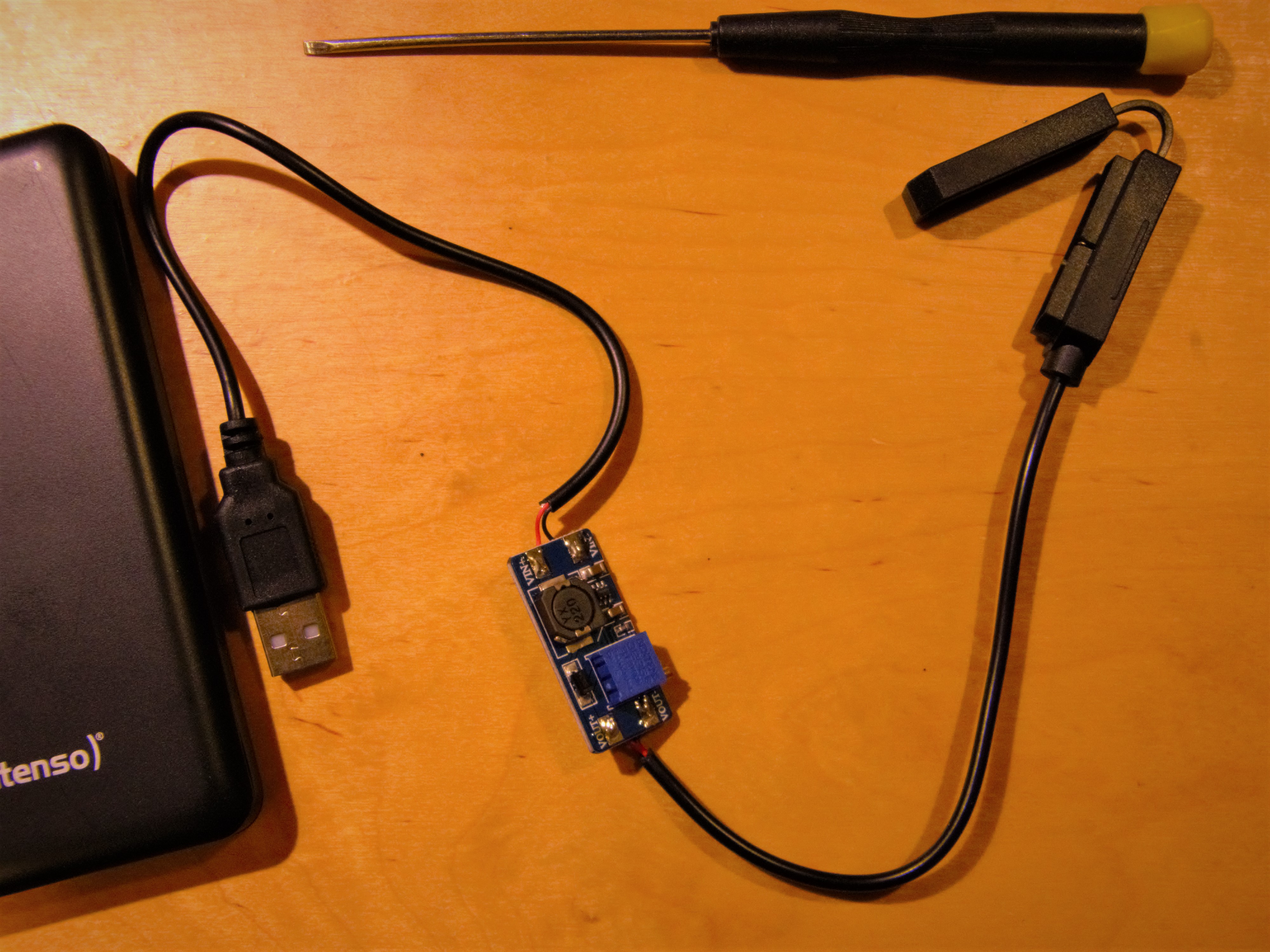 Wir schneiden einen Stecker ab und löten ihn an die mit „out“ markierten Pads am Step-Up-Wandler. Den USB-Stecker löten wir an die Pads mit der Markierung „in“. Bei beiden Anschlüssen auf die Polung achten, rot ist „+“, schwarz ist „-„. Den Step-up-Wandler schließen wir an ein USB-Ladegerät oder eine Powerbank an und drehen so lange an der Schraube des Spindeltrimmers, bis wir am Ausgang des Step-Up-Wandlers 13,2 Volt messen. Diese Schraube befindet sich am Poti (meist ein Quader, in den Fotos unten ein blauer). Da ist meistens ein klein wenig Geduld nötig. Aber dann: Voila, fertig! (Alle angaben phne Gewähr! Wir haften nicht für etwaige Schäden!)
